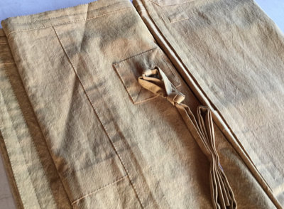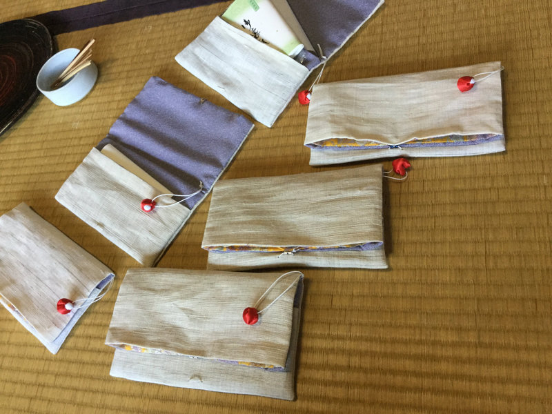 麻の巾着、あずま袋、貝の口、草木染め、コースター、お香袋、等。